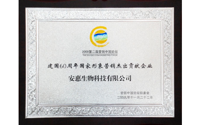 2009年11月22日,安惠公司榮獲“建國(guó)60周年國(guó)家形象營(yíng)銷杰出貢獻(xiàn)企業(yè)”稱號(hào)。