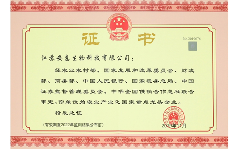 2019年12月,經各省(區、市)遴選推薦、嚴格把關,專家評審和全國農業產業化聯席會議審定,農業農村部公布了第六批300家農業產業化國家重點龍頭企業名單,江蘇安惠生物科技有限公司榜上有名。